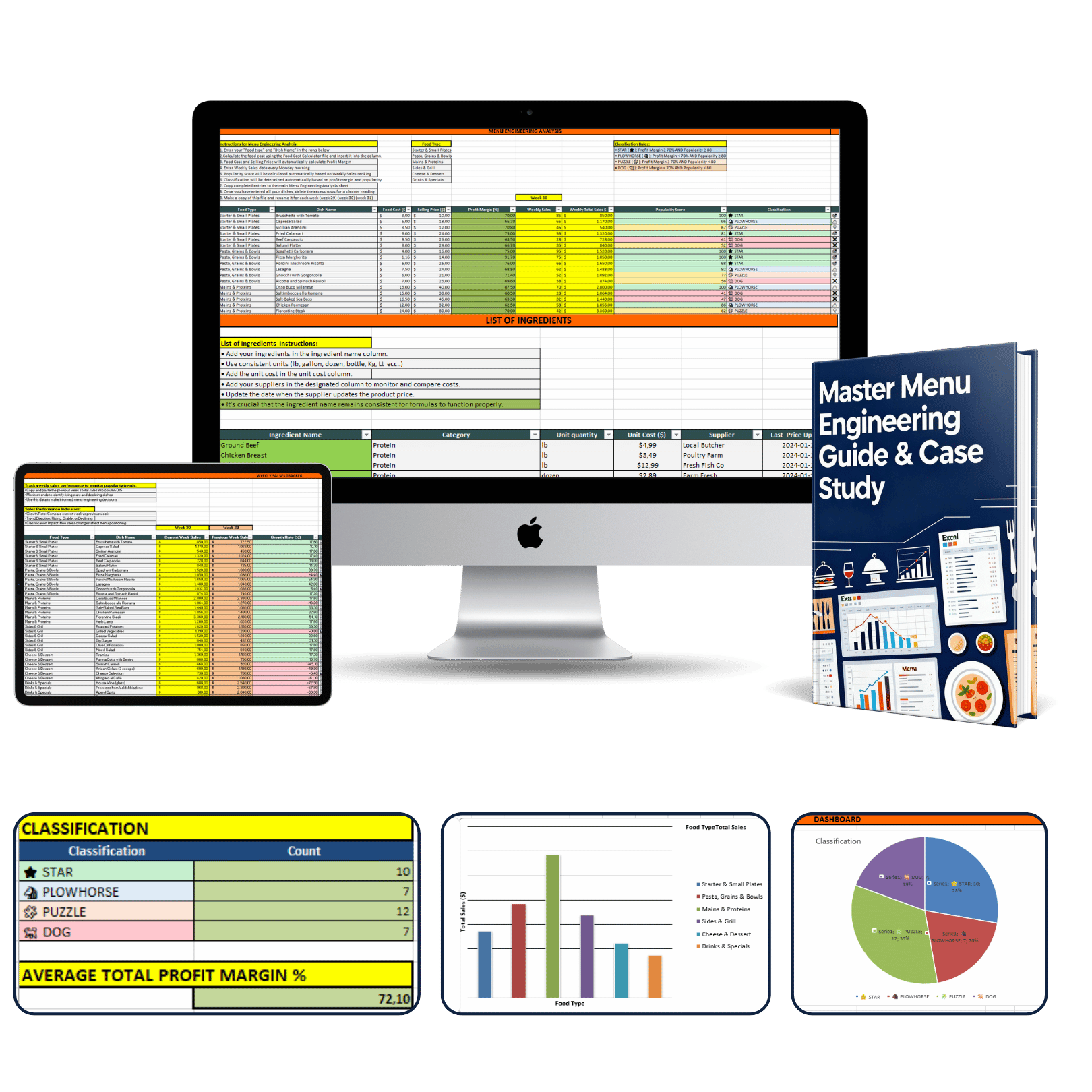 Unlock data-driven profitability for your food business. Master Sales Tracker is the complete Excel-based system that automatically analyzes your menu, identifies profit opportunities, and tells you exactly which dishes to promote, reprice, reformulate, or remove.